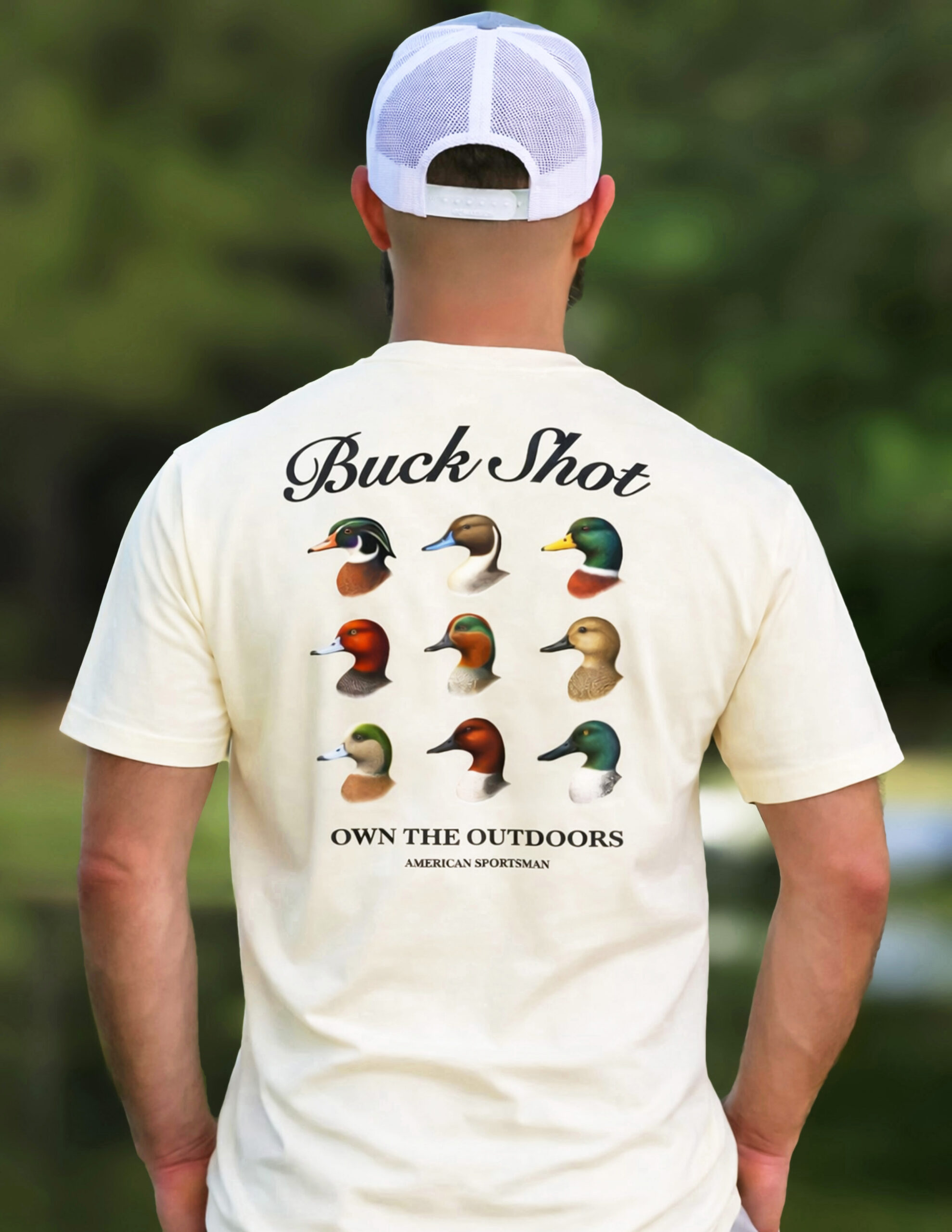 Full back graphic featuring nine highly sought-after duck species